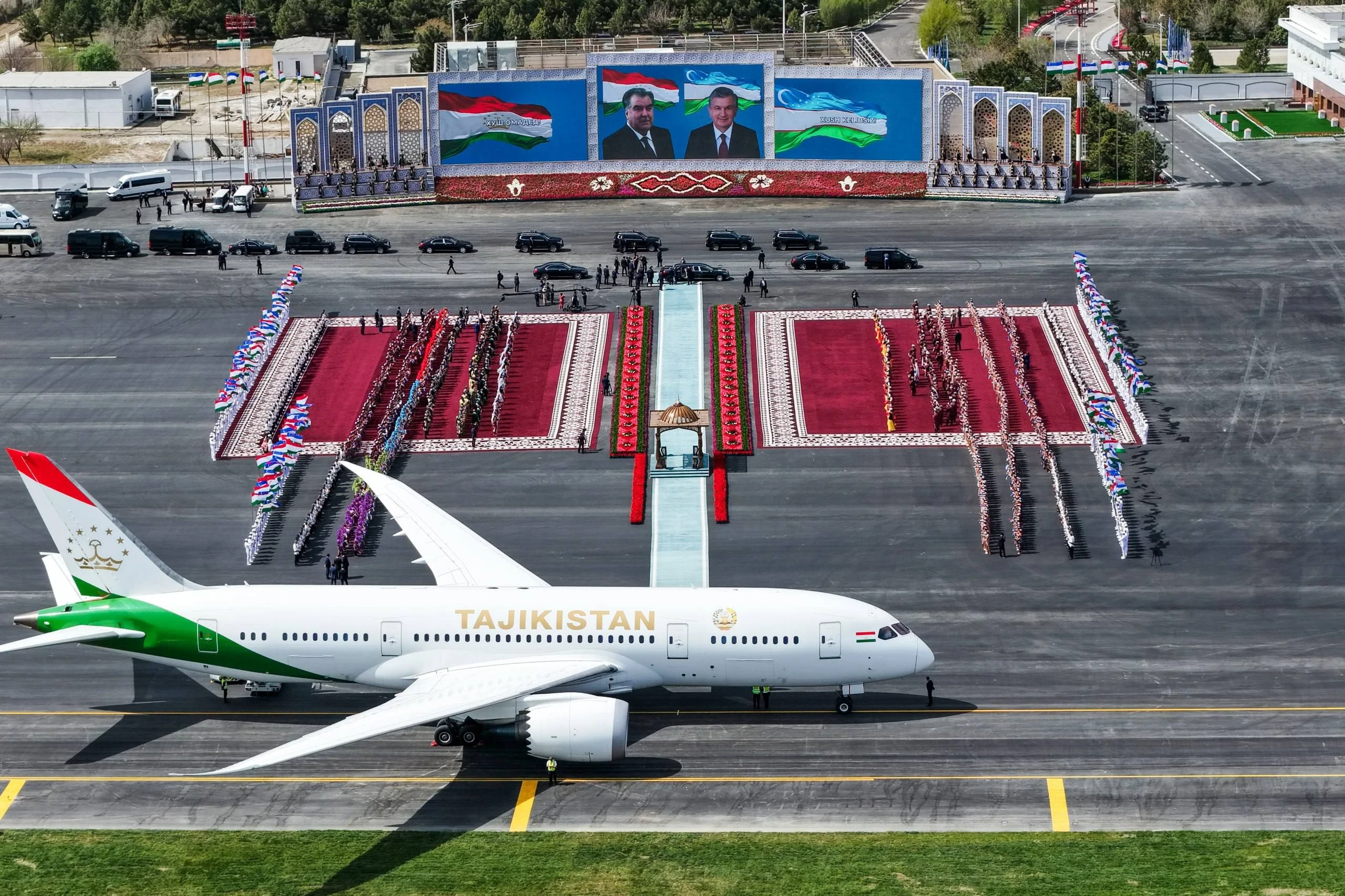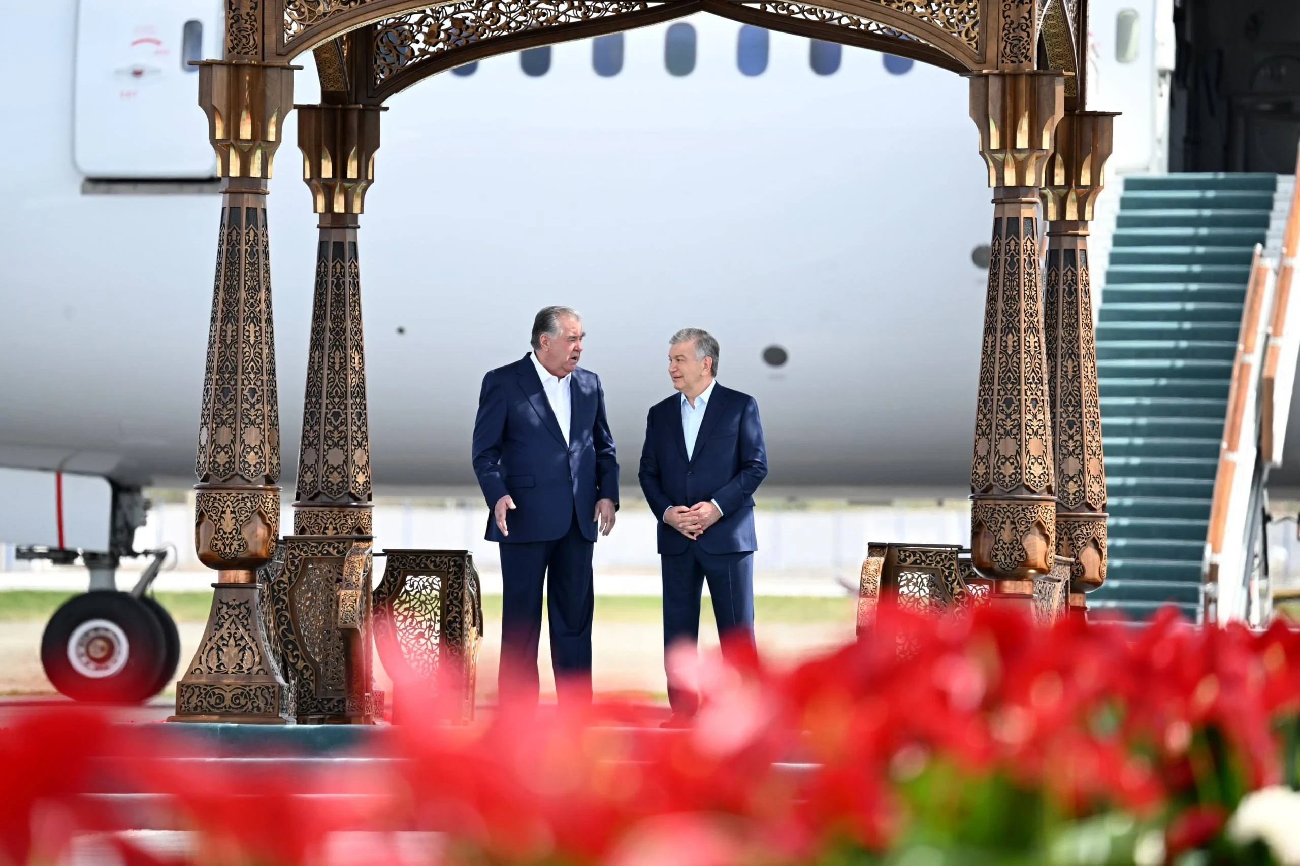 В международном аэропорту Бухары состоялась торжественная встреча. Мирзиёев лично поприветствовал своего таджикского коллегу. В честь высокого гостя прозвучали национальные песни и были исполнены традиционные танцы.