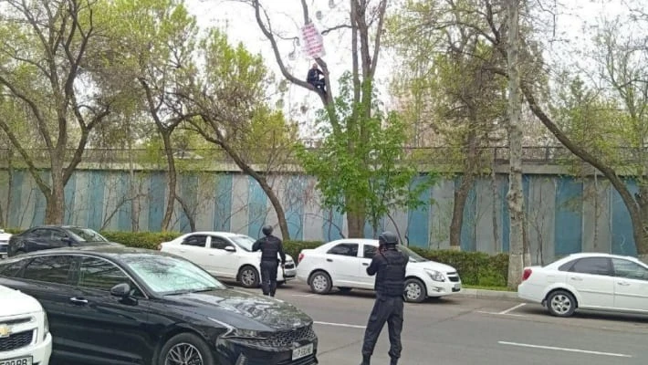 В Ташкенте мужчина устроил акцию у Верховного суда, забравшись на дерево